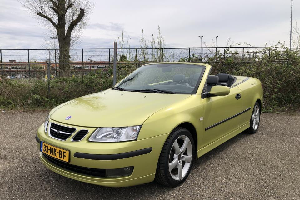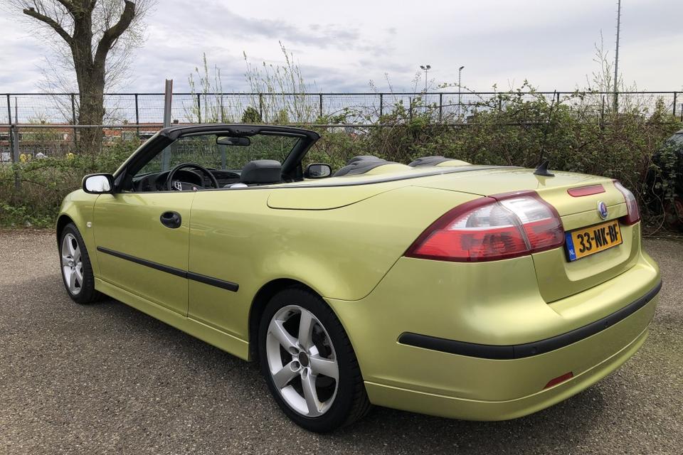 Een SAAB Cabriolet in de introductiekleur Lime Yellow. een unieke Nederlandse auto dealer onderhouden en recent van een nieuw dak voorzien.